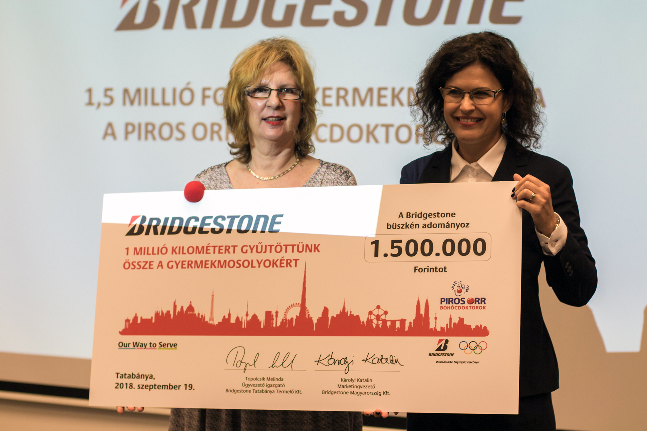 A nevetés és a jókedv gyógyít, ezért a Bridgestone 1.500.000 forintot adományoz a Piros Orr Bohócdoktorok Alapítványnak a munkatársai által a B-Olympic egészségprogramban sétával, futással, úszással, kerékpározással vagy más sporttevékenységgel megtett több mint 10.000 km után. Az alapítvány bohócdoktorai, dr. Spuri és dr. Nyulánka a támogatással a tatabányai Szent Borbála Kórház gyermekosztályán krónikus betegségekkel küzdő és baleset miatt kezelt gyermekek arcára csalnak majd mosolyt, derűt és nevetést.