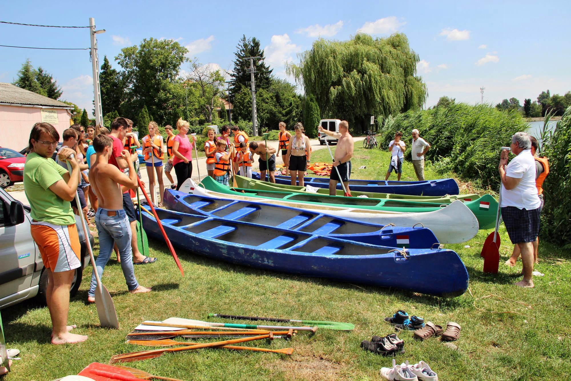 A horgászok és a déli harangszóra érkező vendégek hagyományosan egy-egy tál gulyás, vagy pörkölt mellett elemezték ki a délelőtti eredményeket, s közben a tó eleje is benépesült. A rutinosabb, vagy éppen kezdő kenuzásra várók vízre szállás előtt Gubicza István intelmeit hallgatták, amely a lapát kezeléséről például így szólt: ugyanúgy kell fogni, mint az ásót, csak fordítva. Azt is megtudták, ha rövidre markolják, akkor csak simogatják a vizet, s a 18 év alattiak számára kötelező, a többieknek pedig ajánlott mentőmellények felvétele előtt elhangzott a legfontosabb információ is: ezek a túrakenuk elsüllyedni nem tudnak, felborulni viszont igen…