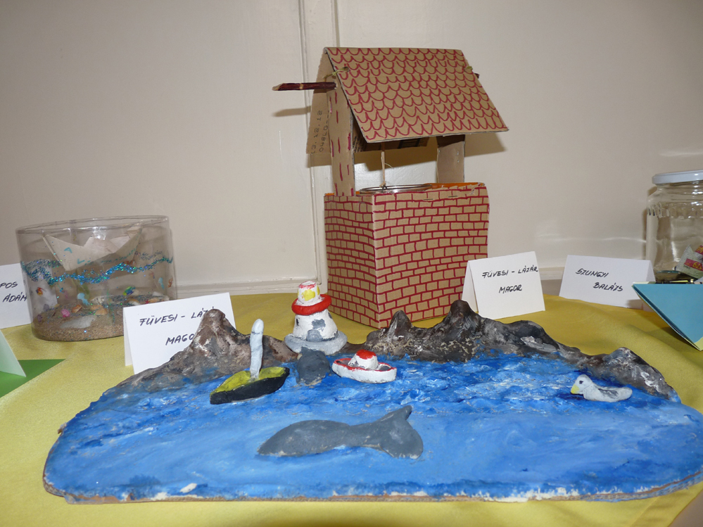 Már a folyosón lévő kiállításon látszik, a gyerkőcök bizony nagyon készültek, otthon is, erre a délelőttre, a vízzel, a vízi élethez kapcsolódó remekművekkel.