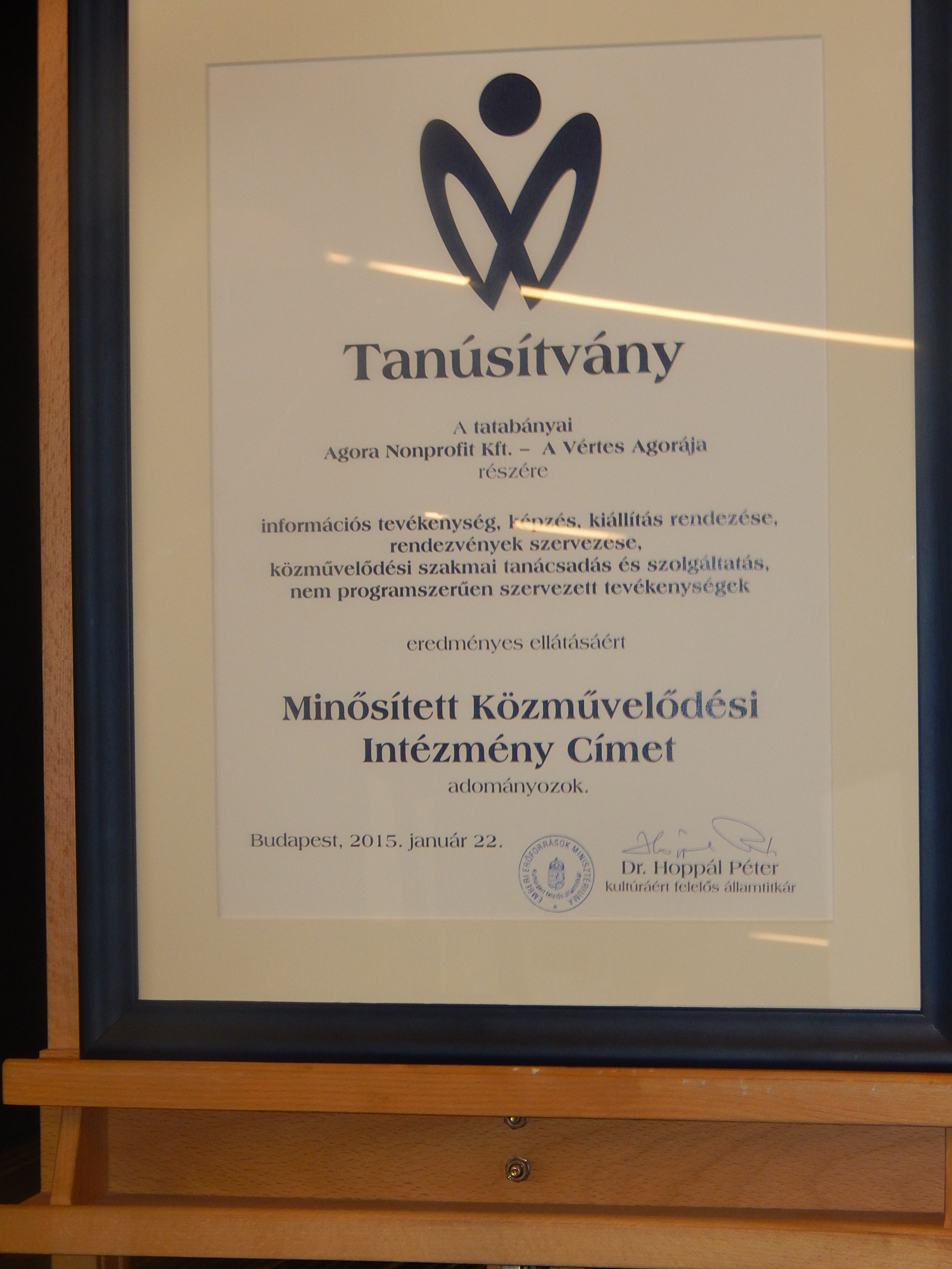 2015. január 22-én – A Magyar Kultúra Napján –, az Emberi Erőforrások Minisztériumában rendezett díjátadón vehette át Salamon Hugó, szakmai vezető a Minősített Közművelődési Intézmény címet, amelyet A Vértes Agorája három évig használhat. Az elismerés apropóján tartott sajtótájékoztatón fény derült a pályázat útján kiérdemelt minősítés hátterére is.