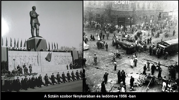 Nagy Imre parlamenti beszéde mellett a forradalom emblematikus megmozdulása volt a városligeti , 1951-ben épült 8 méteres Sztálin szobor ledöntése. A szovjetek melletti politikai elkötelezettséget, és Sztálin dicsőítését jelképező monumentális alkotás a magyarság szemében az elnyomás szimbóluma volt. A tömeg október 23-án ledöntötte hát, majd a szobor fejét a testről leválasztva teherautóval a Blaha Lujza térre, a Nemzeti Színház közelébe vontatta.