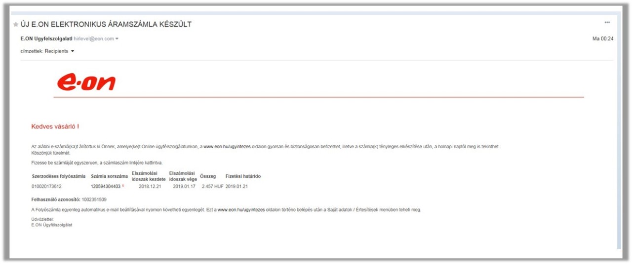 Az E.ON által kiküldött valódi számlaértesítő e-mailek a noreply@eon.com címről érkeznek.