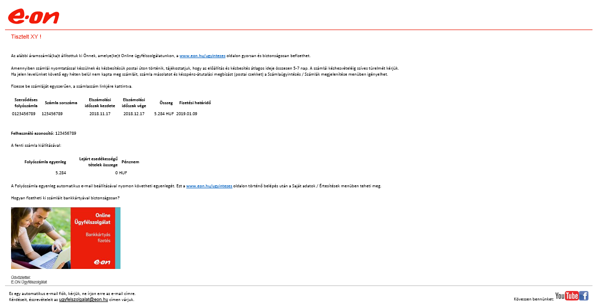 Ismeretlen támadók az E.ON nevében küldenek a vállalat elektronikus számlaértesítőihez nagyon hasonló formátumú e-maileket, és ezzel próbálják elérni, hogy különböző, általában alacsony összegeket átutaljanak számukra.