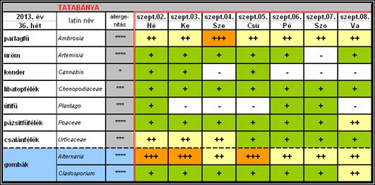 A parlagfű pollenszórása országos viszonylatban ezen a héten tetőzött, Tatabányán azonban a múlt hét vasárnapi csúcs után erősen lecsökkent a parlagfű pollenkoncentrációja – bár a héten végig elérte a tüneteket okozó közepes szintet, nagyon magas koncentrációt a héten nem mértek, magasat is csak szerdán.