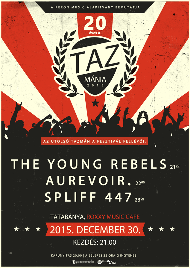 Az estét a fiatal tatabányai The Young Rebels zenekar nyitja, akikre a következő években érdemes lesz figyelnie a rock zenét szerető közönségnek. Zenei tehetségüket már többször bizonyították a még általános iskolába járó fiúk, és rengeteg szakmai elismerést is bezsebelhettek a fiatal korúk ellenére. Az est második fellépője a 20. Peron Music Tehetségkutató második helyezettje, a zsámbéki Aurevoir. zenekar, akik ethno-beat stílusú zenéjükkel igazán egyedi és szórakoztató műsort alkottak. A rendezvény és egyben a 20 éves TAZ-Mánia Fesztivál utolsó akkordjait, a komáromi és révkomáromi zenészekből álló Spliff 447 zenekar fogja eljátszani, akik egyedi hangvételükkel fogják feltenni a koronát a sikeres rendezvénysorozat 20 éves pályafutására.
