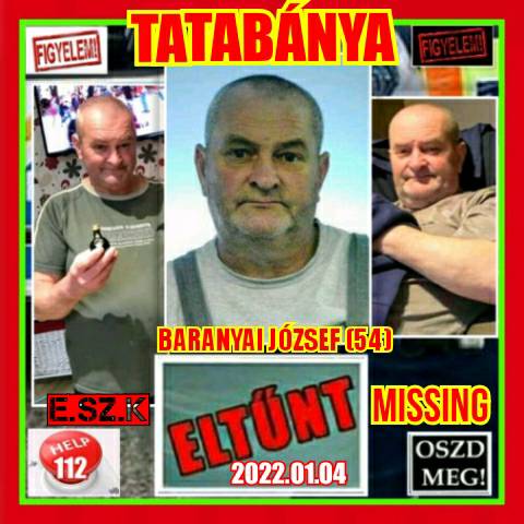 Az 54 éves férfi Tatabányai otthonából 2021.01.04-én ismeretlen helyre távozott és azóta életjelet nem ad magáról. Telefont ,pénzt, iratait nem vitte magával. József 170 cm magas 90 kg, rövid őszes hajú, kékes zöld szemszínű. Cukorbetegsége és vérnyomás problémái vannak. Eltűnésekor vélhetően egy sötétkék kapucnis pulóvert és kék baseball sapkát viselt. Elképzelhető hogy tömegközlekedésre szállt. Családja bejelentette eltűnését a rendőrségen kiadták körözését. Kutató mentő egységek is keresték a férfit, területeket tudtak kizárni hol nincs, és egy irányvonalat megerősítettek valamint tanácsokkal látták el a családot. Köszönjük munkájukat.