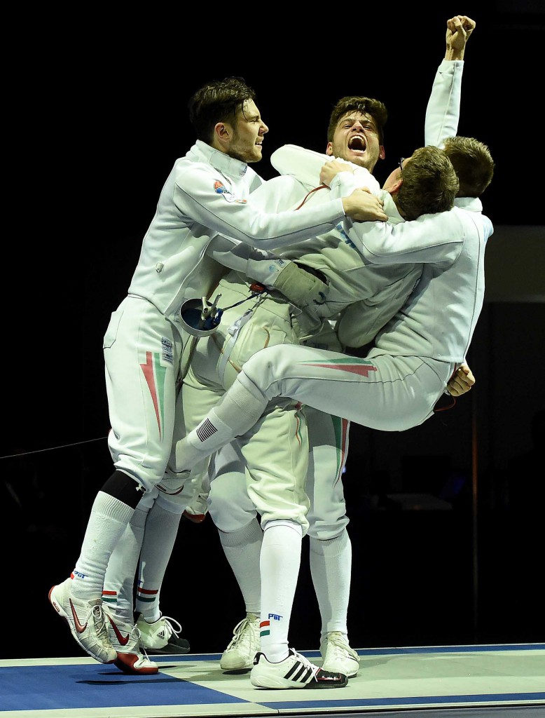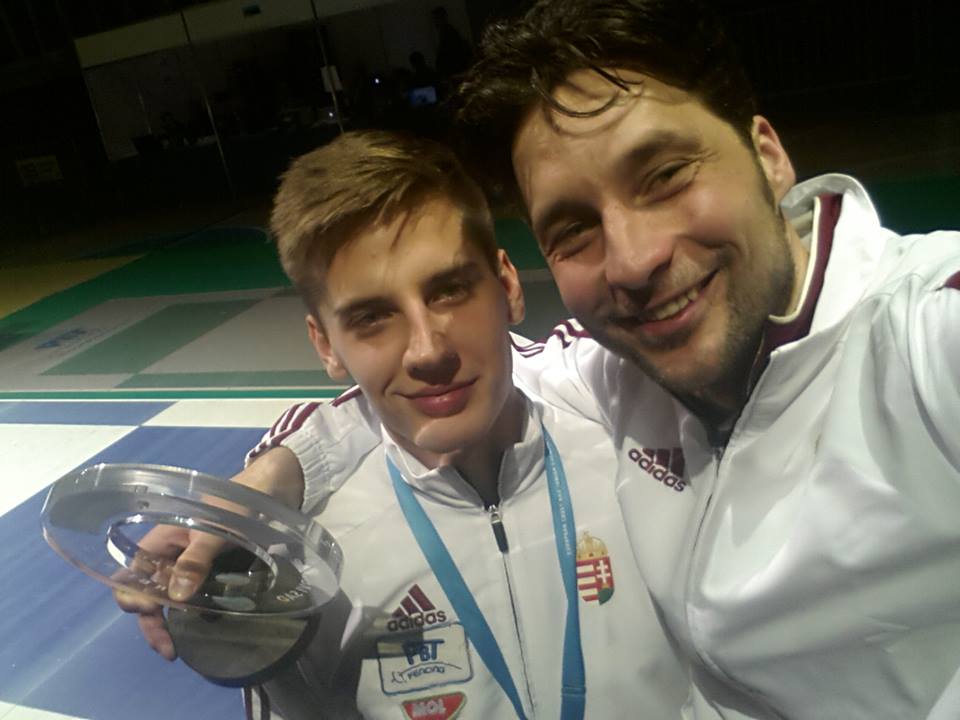 Azok a franciák, akik tavaly a junior Eb-n és a vb-n egyaránt legyőztek bennünket. És nagyon úgy tűnt, hogy ezúttal is. Két asszóval a vége előtt nyolctusos különbséggel vezettek a gallok. Valahogy semmi sem sikerült, és sorra egymás után döntöttek úgy a mieink, hogy némi kísérletezés után nem erőltetik az éppen aktuális asszót, francia előnynél hagyták rá a meccseket, melyben a rivális érthetően partner volt. Az utolsó előtti csörtében aztán Zsombor összekapta magát, és kettőt faragott a különbségből. Így “csak” 30:24-es hátránynál lépett pástra Geri. Beadta az első két tust, amikor a tribünön ülő korábbi klasszis párbajtőrfejező,Kovács Ivánközömbös hangon közölte, hogy “Megvan a meccs, be…. az ellenfél!” Na azért ennyire nem volt egyszerű… Geri tusról tusra haladt, alig több mint két perc alatt egyenlített. Esett még egy-egy tus, aztán harminc másodperccel a vége előtt ráhagyták a felek. Ismét jött a hirtelen halál, melyben a “balatoni predátor” ezúttal sem kegyelmezett. Ellenállhatatlan kitöréssel talált, hogy aztán a csapat pillanatok alatt egy kupacban ünnepelhessen. Geri a napot +39-cel zárta párbajtőrben, az elődöntőben és a döntőben jelentős hátrányból fordított, miután két nappal előtte megnyerte az egyéni versenyt. Na kérem, ezt lehet überelni! Hatalmas gratuláció valamennyi versenyzőnek, válogatott edzőnek és mesternek!