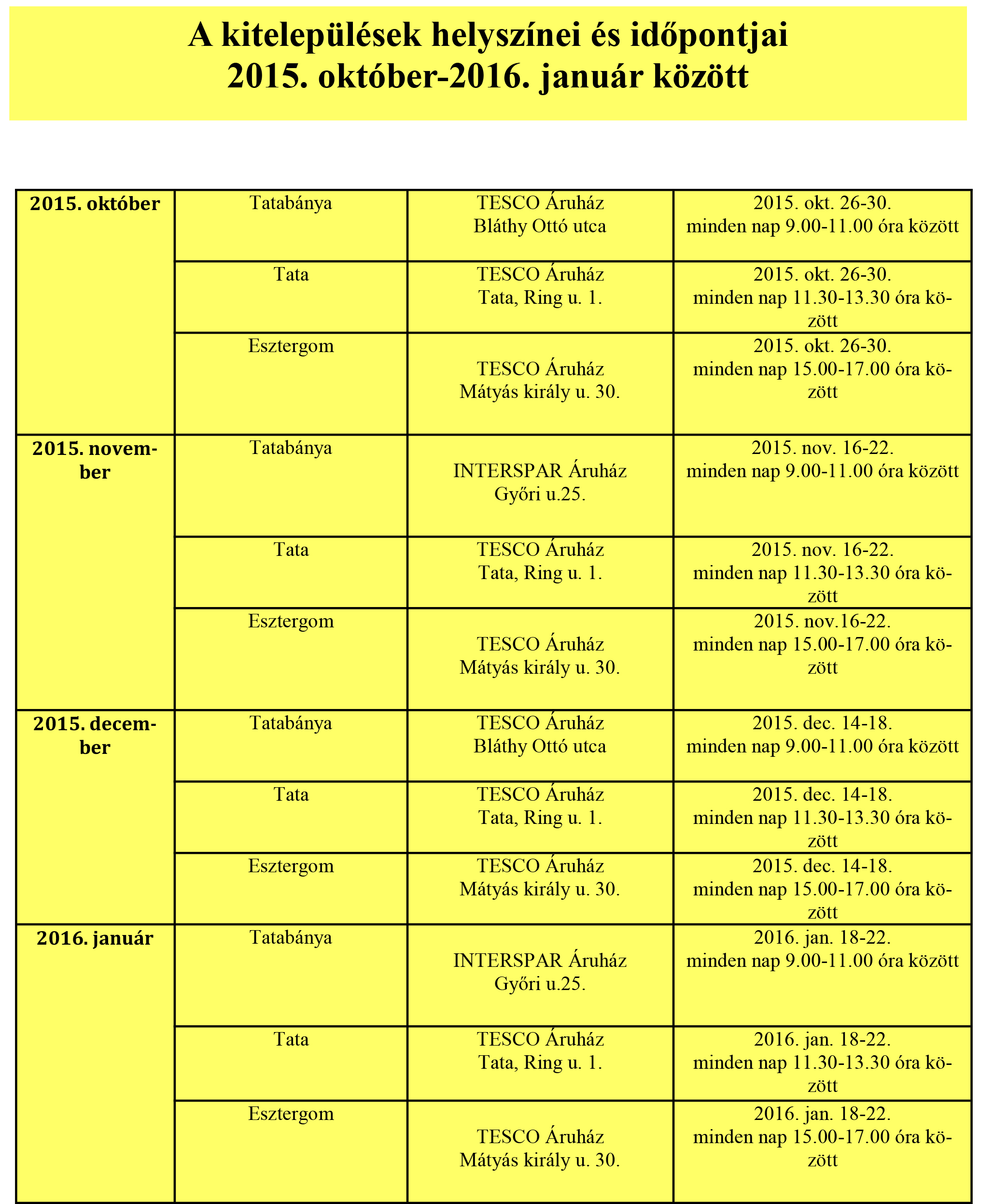 2015. október végétől országos vagyonvédelmi program indul. A program során minden megyében –így Komárom-Esztergom me-gyében is– bűnmegelőzési szakemberek várják az érdeklődőket minden hónapban egy héten át a megye három településén. Me-gyénkben Tatabányán, Tatán és Esztergomban zajlik a program. A bűnmegelőzési szakemberek vagyonvédelmi tanácsokkal és tá-jékoztató kiadványokkal várják az érdeklődőket. Lehetőség lesz arra is, hogy valaki lakásában, házában személyes tanácsadást kapjon. Ha valaki szeretné, hogy a bűnmegelőzési szakember „házhoz menjen”, a kitelepüléseken jelezheti ezt az igényét szó-ban, és egy rövid nyomtatványt kérünk ehhez kitölteni.