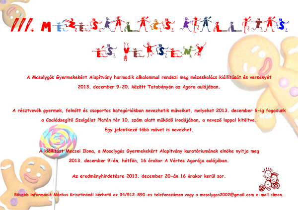 A Mosolygós Gyermekekért Alapítvány harmadik alkalommal rendezi meg mézeskalács kiállítását és versenyét 2013. december 9-20. között Tatabányán az Agora aulájában.