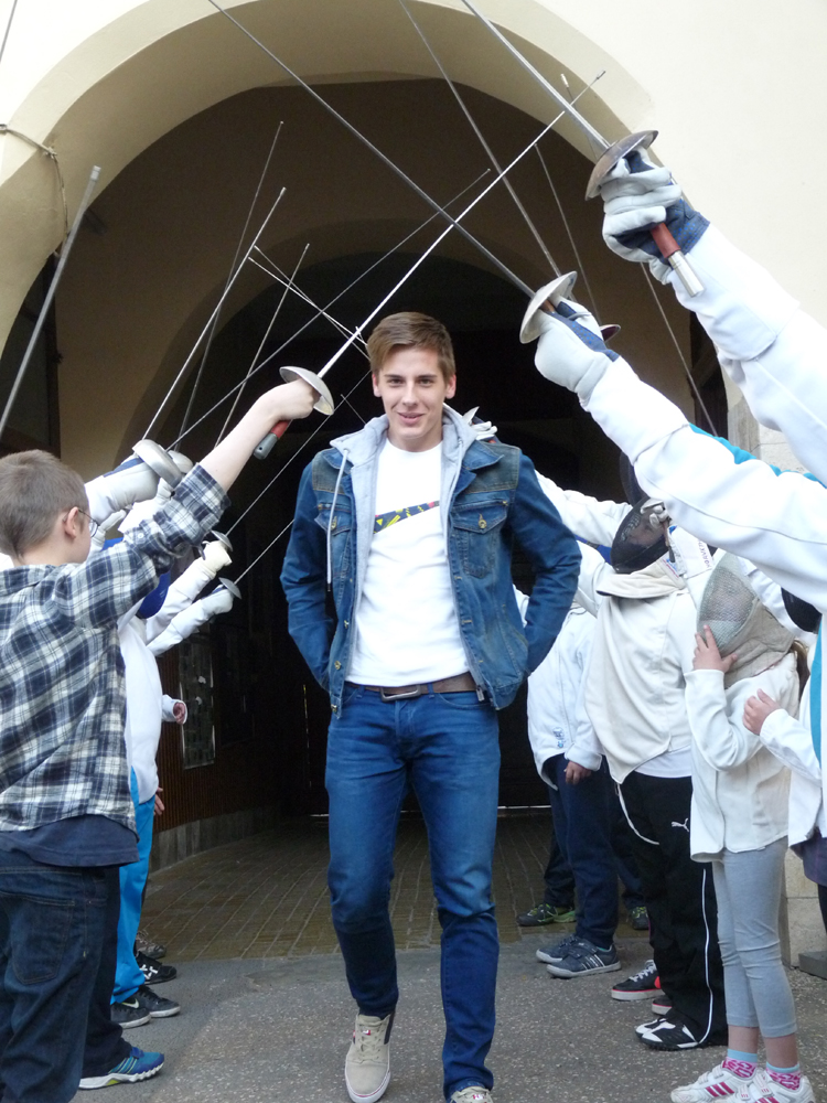 Nehéz volt könnyek nélkül megállni tegnap délután, amikor kinyílt a Vaszary iskola kapuja és megláttuk Esztergályos Patrik arcát, ahogy belépett az udvarra. A legkisebbek sorfalat álltak, szólt a Queen és a vastaps ennek a rendkívül szimpatikus fiatalembernek, aki szombat este felért a párbajtőr-világ tetejére. A sokadalom közepén ott várta valaki, akivel együtt indultak el régen ezen sokszor rögös, de mégis szép úton, aki mindig ott volt mellette. Mestere, Partali Csaba sem tudott megszólalni, csak hosszan magához ölelte a tanítványát és ők ketten mindent értettek, mi pedig álltunk újfent meghatottan.