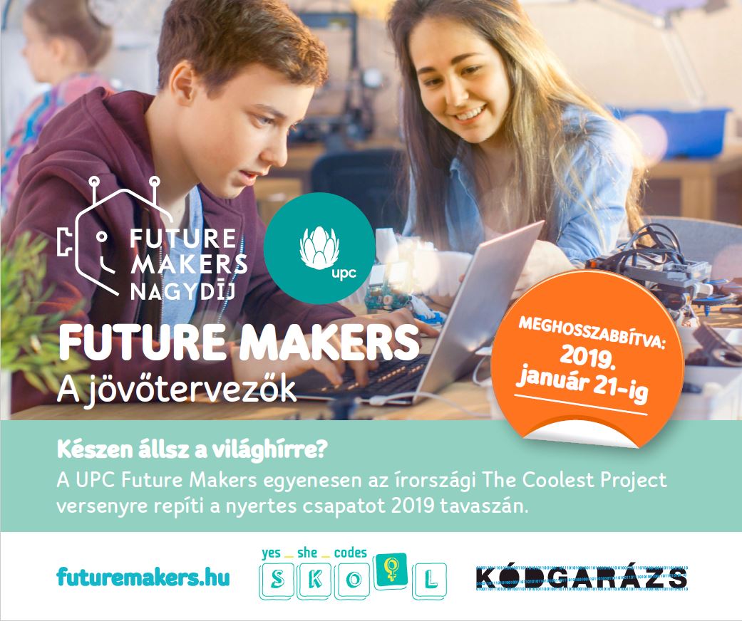 A Future Makers Nagydíjat a UPC Magyarország a SKOOL és a Kódgarázs szakmai közreműködésével még októberben hirdette meg. Az általános- és középiskolás diákoknak szóló programozóversenyre 12 és 16 év közötti diákok nevezhetnek, 3 fős csapatokban, olyan saját fejlesztésű applikációkkal vagy weboldallal, amelyek valamilyen, az egész társadalmat, vagy a helyi közösséget érintő problémára adnak megoldást a technológia és digitális eszközök segítségével. A győztes csapat jutalma egy írországi utazás, amelynek keretében részt vehetnek a világ egyik legizgalmasabb innovációs eseményén, és ott a nemzetközi közönség előtt is bemutathatják alkotásukat
