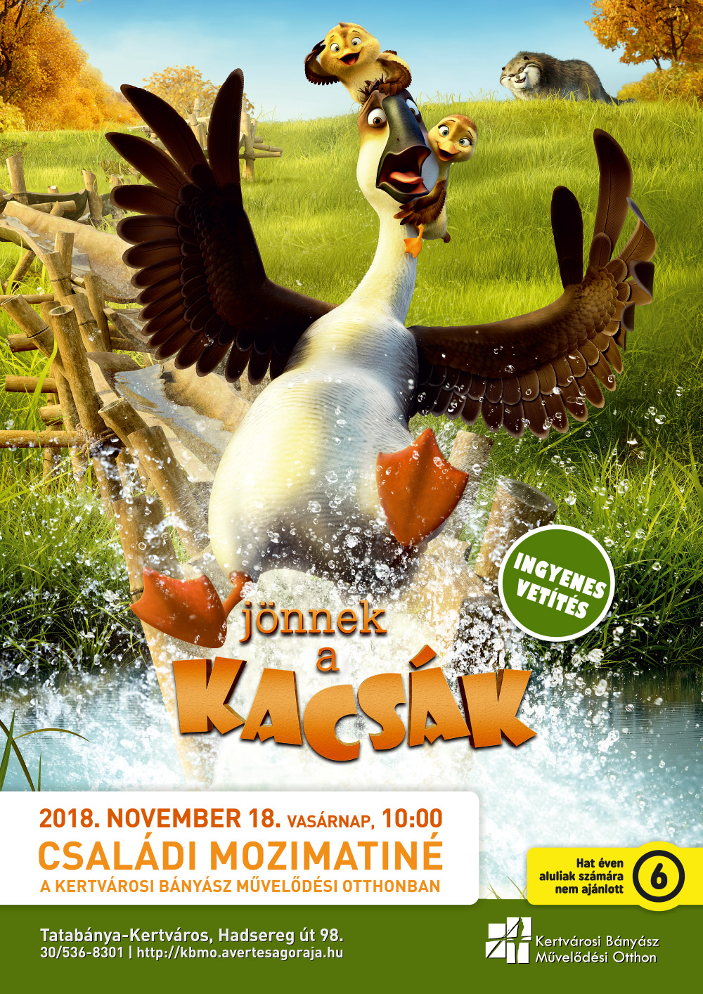 November 18-án ismét ingyenes mozimatiné előadás lesz a Bányász Művelődési Otthonban. 10 órától a Jönnek a kacsák c. animációs filmet láthatják széles vásznon kicsik és nagyok.