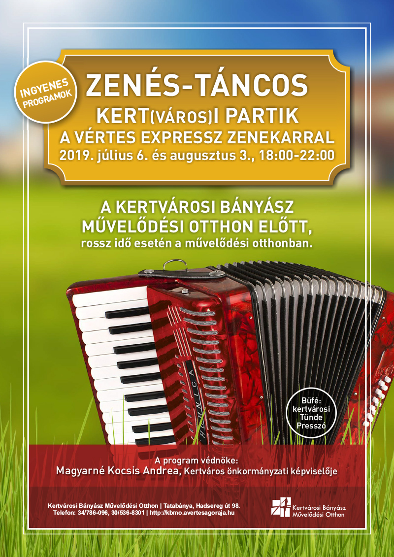 Tatabányán, a Bányász Művelődési Otthon szervezésében idén is folytatódnak a Kert(város)i Parti programok július és augusztus első szombatján 18 és 22 óra között.