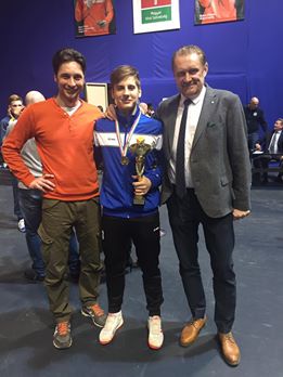 A férfiaknál közel száz vívó lépett pástra. Esztergályos Patrik OMS-Tata 5/1 kört követően a 20. helyről kezdte meg a direkt kieséses táblán az asszókat. Rendkívül nehéz ágon menetelt végig az esti döntőig, ahol a Vasas színeiben induló – 2 hete felnőtt Világkupa-versenyen lett egyéni bronzérmes – Koch Mátéval csapott össze és rendkívül magabiztosan nyert 15/7 arányban és Magyar Bajnok.