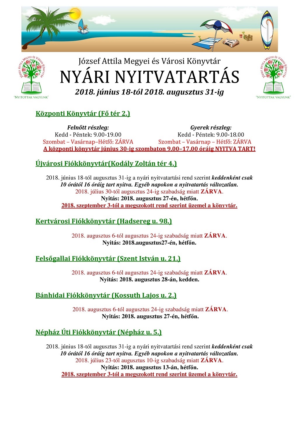 A József Attila Megyei és Városi Könyvtár 2018. július 1-jétől augusztus 31-ig nyári nyitvatartás szerint várja az olvasás szerelmeseit.