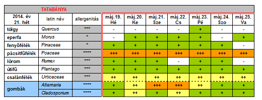 A 21. héten, a melegebb idő hatására Tatabányán is jelentősen fokozódott a pázsitfűfélék és a csalánfélék pollenszórása.