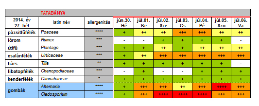 Az OKI Aerobiológiai Hálózatának Tatabányára vonatkozó 27. heti jelentése: