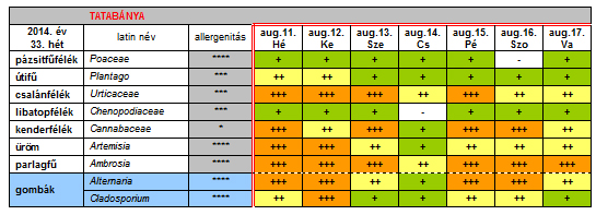 Az OKI Aerobiológiai Hálózatának Tatabányára vonatkozó 33. heti jelentése: