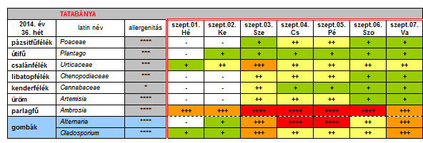 Az OKI Aerobiológiai Hálózatának Tatabányára vonatkozó 36. heti jelentése
