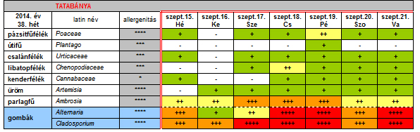 OKI Aerobiológiai Hálózatának Tatabányára vonatkozó 38. heti jelentése