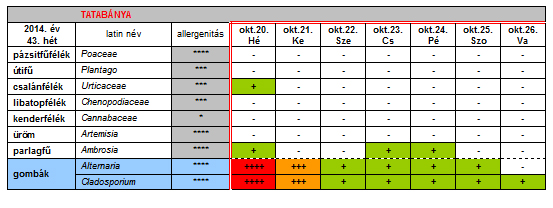 Az OKI Aerobiológiai Hálózatának Tatabányára vonatkozó 43. heti jelentése: