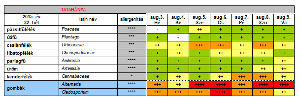 Az OKK Aerobiológiai Hálózatának Tatabányára vonatkozó 32. heti jelentése: