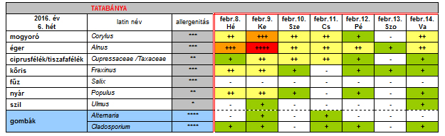 A 6. héten Tatabányán, az éger pollenkoncentrációja hétfőn magas, kedden pedig nagyon magas volt, szerdától azonban közepes szintűre mérséklődött.