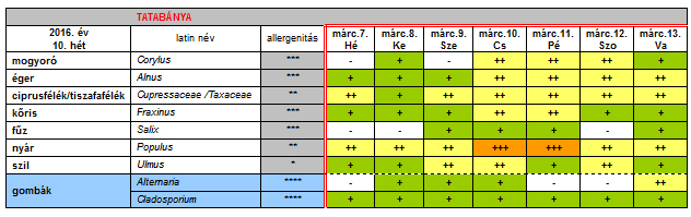 A 10. héten Tatabányán a ciprus- és tiszafafélék, valamint a nyárfa pollenje dominált a levegőben, koncentrációjuk jellemzően közepes volt, bár a nyárfáé csütörtökön és pénteken elérte a magas szintet is.