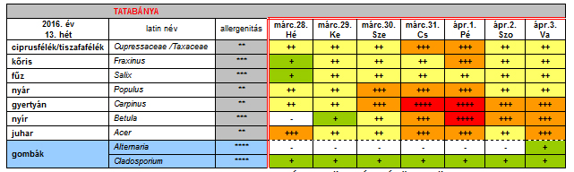 OKK Aerobiológiai Hálózatának Tatabányára vonatkozó 13. heti pollen jelentése