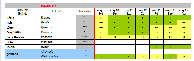 Az OKK Aerobiológiai Hálózatának Tatabányára vonatkozó 19. heti jelentése:
