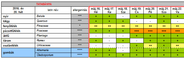Az OKK Aerobiológiai Hálózatának Tatabányára vonatkozó 20. heti jelentése: