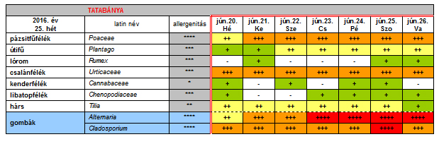 Az OKK Aerobiológiai Hálózatának Tatabányára vonatkozó 25. heti jelentése: