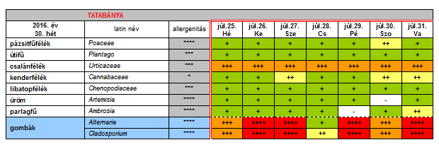 Az OKK Aerobiológiai Hálózatának Tatabányára vonatkozó 30. heti jelentése: