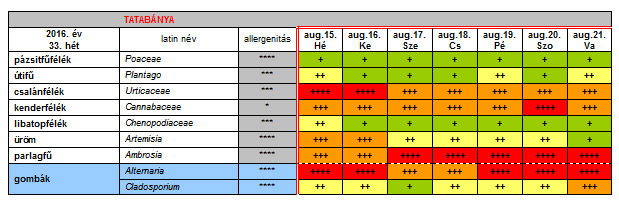 Az OKK Aerobiológiai Hálózatának Tatabányára vonatkozó 33. heti jelentése