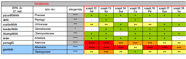 Az OKK Aerobiológiai Hálózatának Tatabányára vonatkozó 37. heti jelentése: