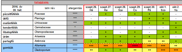 Az OKK Aerobiológiai Hálózatának Tatabányára vonatkozó 39. heti jelentése: