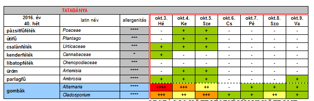Az OKK Aerobiológiai Hálózatának Tatabányára vonatkozó 40. heti jelentése