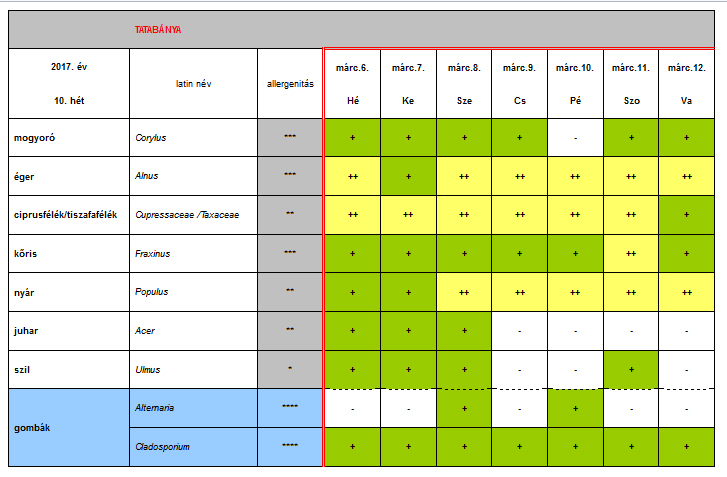 Az OKK Aerobiológiai Hálózatának Tatabányára vonatkozó 10. heti jelentése