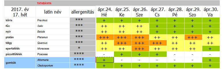 A 17. héten Tatabányán a platán és a tölgy pollenje dominált a levegőben, koncentrációjuk a közepes-magas tartományban alakult.