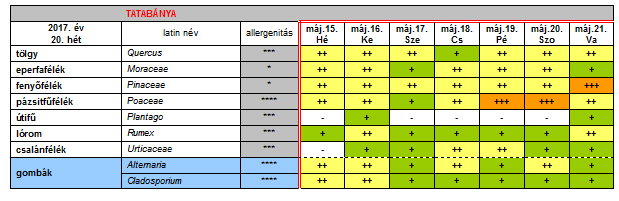 Az OKK Aerobiológiai Hálózatának Tatabányára vonatkozó 20. heti jelentése: