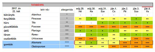 Az OKK Aerobiológiai Hálózatának Tatabányára vonatkozó 22. heti jelentése: