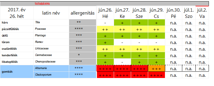 OKI Aerobiológiai Hálózatának Tatabányára vonatkozó 26. heti jelentése: