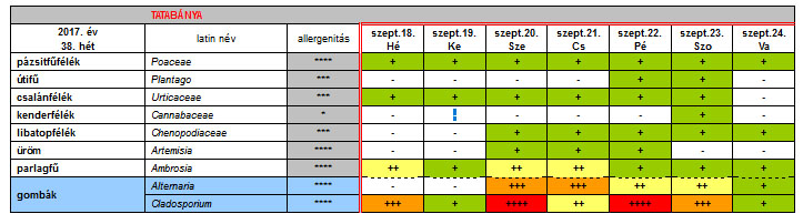 Az OKI Aerobiológiai Hálózatának Tatabányára vonatkozó 38. heti jelentése:
