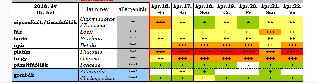 Az OKI Aerobiológiai Hálózatának Tatabányára vonatkozó, 2018. évi 16. heti jelentése:
