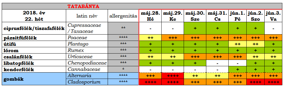 OKI Aerobiológiai Hálózatának Tatabányára vonatkozó, 2018. évi 22. heti jelentése: