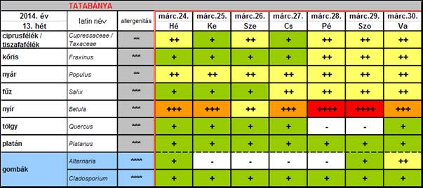 Az OKI Aerobiológiai Hálózatának Tatabányára vonatkozó 13. heti jelentése
