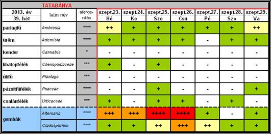 A 39. héten Tatabányán az előző hetihez képest is jelentősen lecsökkent a pollenterhelés. A parlagfű pollenszórása is erősen visszaesett – a héten magas koncentrációt már egyáltalán nem mértek, tüneteket okozó közepes szintet is csak hétfőn és vasárnap. A parlagfű virágpora mellett jelen volt még a csapdában az üröm, a csalánfélék, a pázsitfűfélék, a fészkesvirágzatúak és a libatopfélék pollenje is – legfeljebb alacsony koncentrációban.