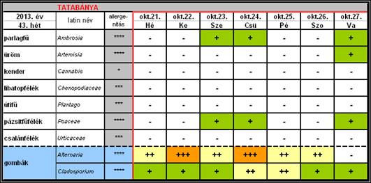A kültéri allergén gombák közül az Alternaria mennyisége elérte a magas szintet, a Cladosporiumé legfeljebb közepes volt.