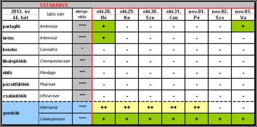 Az OKI Aerobiológiai Hálózatának Tatabányára vonatkozó 44. heti jelentése: