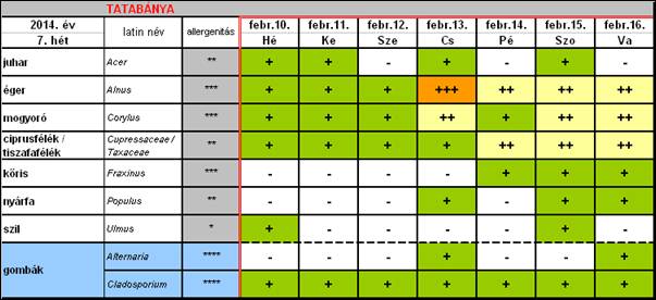 A 7. héten a felmelegedés hatására Tatabányán is felerősödött a mogyoró, az éger, valamint a ciprus- és tiszafafélék pollenszórása